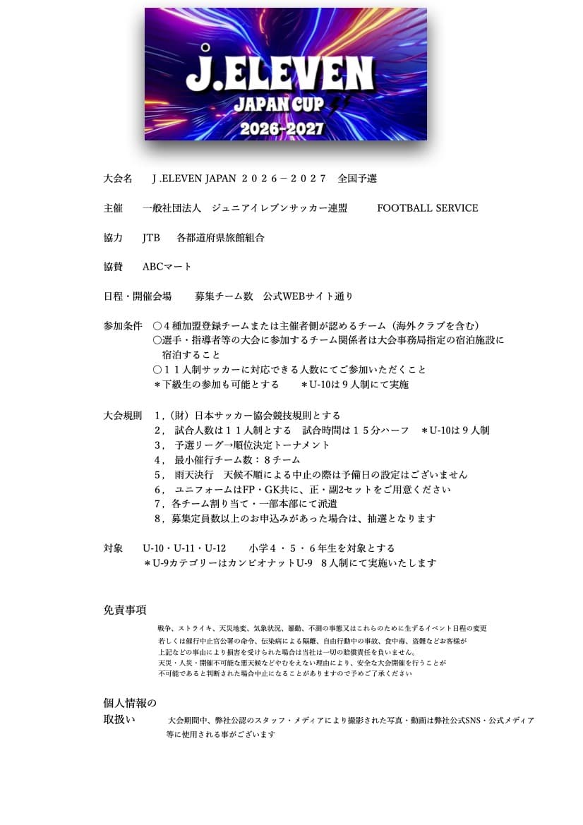 ○4種加盟登録チームまたは主催者側が認めるチーム(海外クラブを含む)○選手・指導者は大会指定の宿泊施設に宿泊すること J.eleven 大会要項
